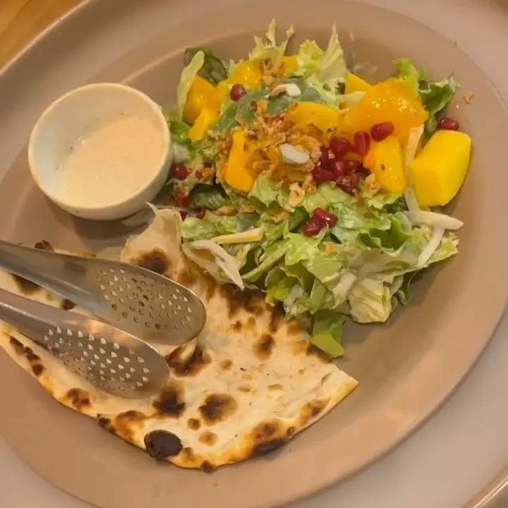가장 먼저 나온 건 망고 샐러드. 신선한 야채 위에 달콤한 망고가 듬뿍 올려져 있었고, 상큼한 드레싱이 입맛을 돋우어 주었다. 샐러드와 함께 나온 난에 샐러드를 싸서 먹으니, 부드러운 난의 식감과 망고의 달콤함이 어우러져 환상적인 맛을 선사했다. 샐러드를 다 먹기도 전에 다음 메뉴가 나왔다. 마치 인도 여행을 온 듯한 기분!