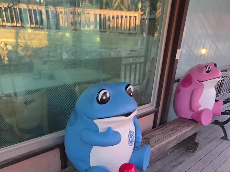 식당 입구에는 파란색과 분홍색 개구리 조형물이 놓여 있었다. 아이들이 좋아할 만한 귀여운 모습이었다. 식당 주변에는 나무들이 심어져 있어서, 봄이나 여름에는 더욱 아름다운 풍경을 감상할 수 있을 것 같다. 식사를 마치고 잠시 산책을 즐기는 것도 좋을 것 같다.