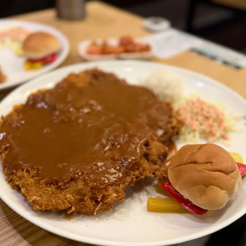 돈까스 외에도 밥, 양배추 샐러드, 마카로니 샐러드, 그리고 모닝빵까지 함께 나왔어. 특히 모닝빵에 돈까스와 샐러드를 넣어 미니 돈까스 버거를 만들어 먹는 게 이 집의 묘미라고 하더라고. 나도 한번 만들어봤는데, 정말 꿀맛이었어! 혼자서도 이렇게 푸짐하게 즐길 수 있다니, 정말 감동이었지.