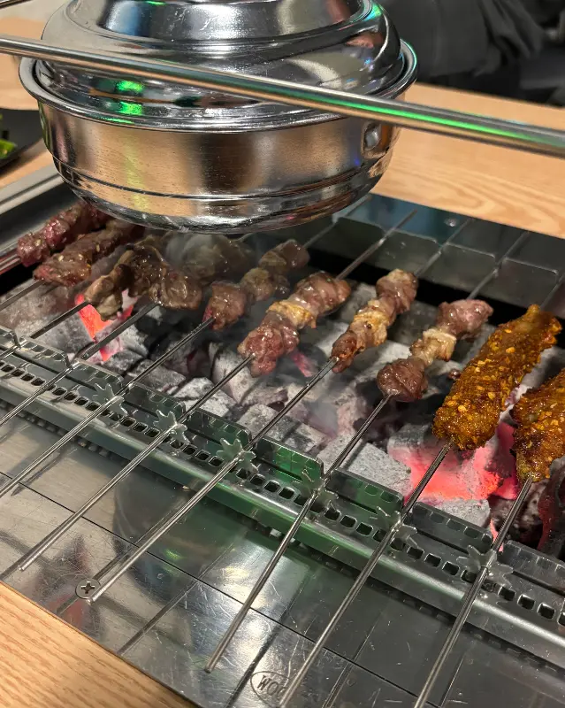 무한리필 메뉴를 시키니, 요리 메뉴 중 하나를 서비스로 선택할 수 있다는 점이 마음에 쏙 들었다. 꿔바로우, 크림새우, 마라샹궈 등 다양한 선택지 앞에서 고민하다가, 결국 꿔바로우를 골랐다. 겉은 바삭하고 속은 쫄깃한 꿔바로우는 양꼬치와 환상의 궁합을 자랑하니까. 잠시 후, 숯불이 들어오고, 드디어 양꼬치와의 만남을 눈앞에 두게 되었다.