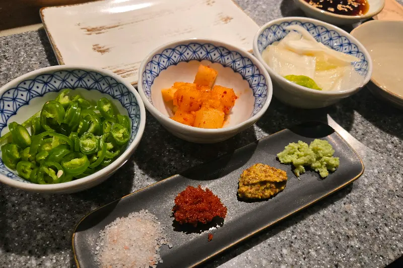 주문을 마치자 곧바로 밑반찬이 세팅되었다. 젓갈, 백김치, 고추절임, 네 종류의 소스(소금, 고추장, 겨자, 와사비)가 깔끔하게 담겨 나왔다. 특히, 4가지 소스를 한 번에 맛볼 수 있도록 준비해주는 점이 마음에 들었다.
