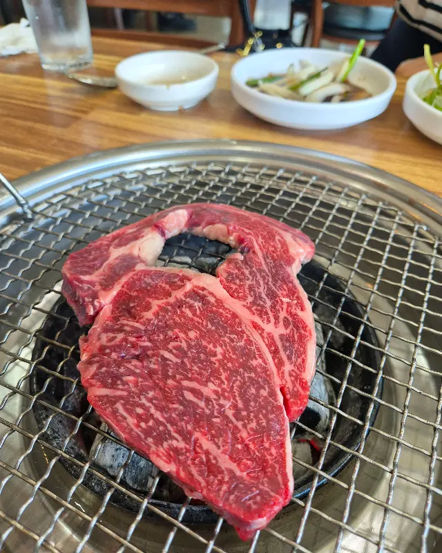 주문을 마치자, 순식간에 밑반찬들이 테이블을 가득 채웠다. 샐러드, 겉절이, 쌈 채소 등 푸짐한 구성에 입이 떡 벌어졌다. 특히 눈길을 끌었던 것은 육회였다. 싱싱한 육회는 입에 넣자마자 사르르 녹아내렸다. 달콤하면서도 고소한 맛이 일품이었다. 육회를 먹으면서 메인 메뉴인 갈비살과 뭉티기를 기다렸다. 밑반찬부터 이렇게 맛있으니, 메인 메뉴는 얼마나 더 맛있을까? 기대감이 점점 더 커져갔다.