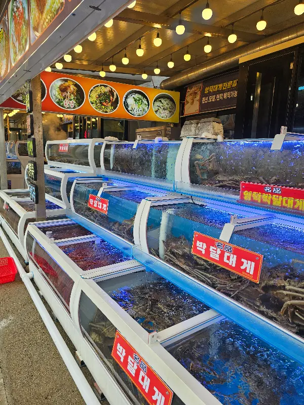 강구항 초입부터 호객 행위가 장난 아니었다. “여기 싸요!”, “살 꽉 찼어요!” 외침을 애써 무시하며 꿋꿋이 대게원해를 찾아갔다. 첫인상은 깔끔하다는 느낌. 수족관에는 싱싱한 대게들이 가득했다. 큼지막한 “박달대게”라는 팻말이 눈에 띄었다. 일단 합격!