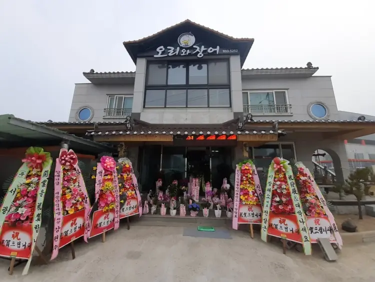 드디어 도착한 “오리와장어”. 큼지막한 간판이 한눈에 들어왔다. 건물 앞에 화려한 화환들이 줄지어 있는 모습이 인상적이다. 외관부터가 ‘나 맛집이야’라고 말하는 듯했다. 주차장도 넉넉해서 차를 가지고 와도 걱정 없겠다. 혼자 여행하는 나에게 주차는 언제나 중요한 고려 사항이니까.