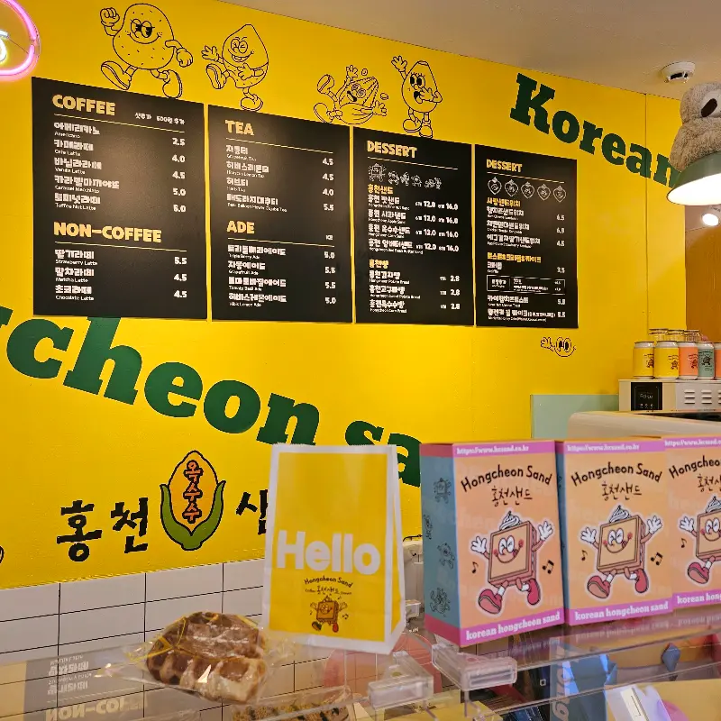 * 메뉴: 홍천샌드 (사과, 옥수수, 잣 등), 앙버터 샌드, 고구마빵, 커피, 라떼, 아메리카노 등