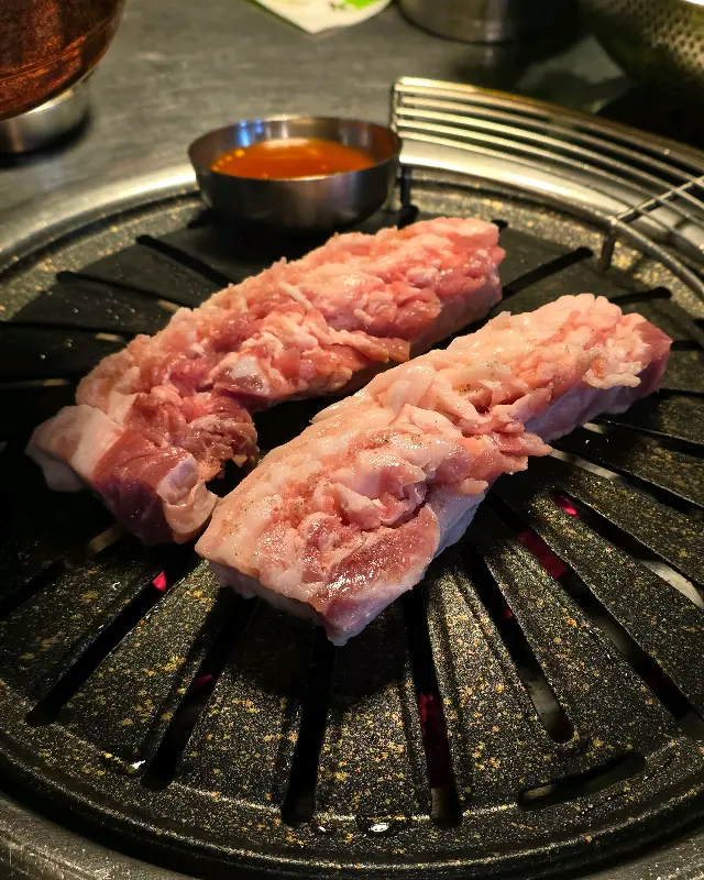 메뉴판을 펼쳐 들고 우리는 신중하게 메뉴를 골랐다. 삼겹살, 항정살, 갈매기살… 뇌는 이미 각 부위의 맛을 시뮬레이션하며 행복한 고민에 빠졌다. 고민 끝에 우리는 삼겹살과 항정살을 먼저 주문하기로 결정했다. ‘창고’에서는 특히 항정살이 맛있다는 정보를 입수했기 때문이다. 잠시 후, 우리의 기대를 저버리지 않고 두툼한 삼겹살과 아름다운 마블링을 자랑하는 항정살이 테이블 위에 놓였다. 고기의 신선도는 최상급으로 보였다. 표면의 촉촉함은 육즙이 풍부하게 살아있음을 암시했다.