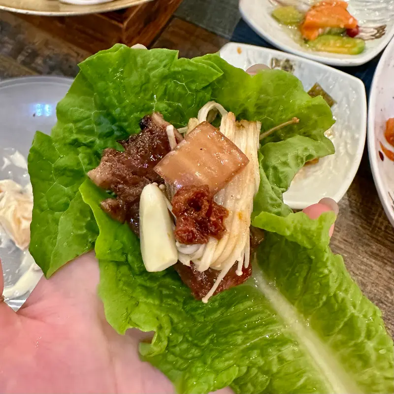 신선한 쌈 채소에 떡갈비를 얹어 먹으니 그야말로 환상적인 맛이었다.