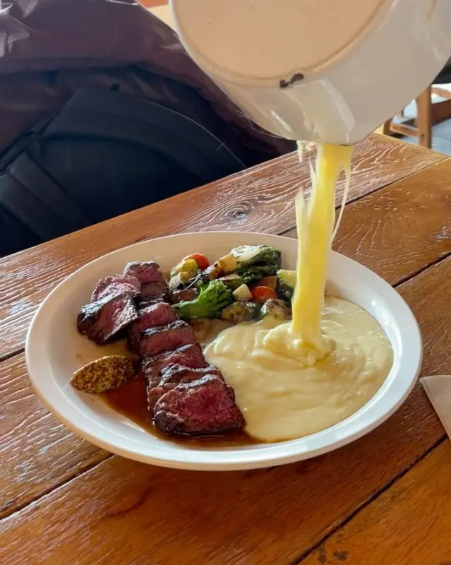 가장 먼저 등장한 것은 조밀 스테이크. 접시 위에 예술 작품처럼 놓인 스테이크의 자태에 감탄했다. 겉은 갈색으로 먹음직스럽게 시어링되었고, 속은 촉촉한 붉은색을 띠고 있었다. 160도에서 일어나는 마이야르 반응이 완벽하게 구현된 결과물이다. 곁들여진 구운 야채는 색감의 조화를 더했고, 홀그레인 머스타드는 스테이크의 풍미를 끌어올리는 데 도움을 줄 것이다. 특히 눈길을 사로잡는 것은 감자 치즈 퓨레. 마치 액체 질소처럼 스테이크 위에 부어주는 퍼포먼스는 시각적인 즐거움을 극대화했다.