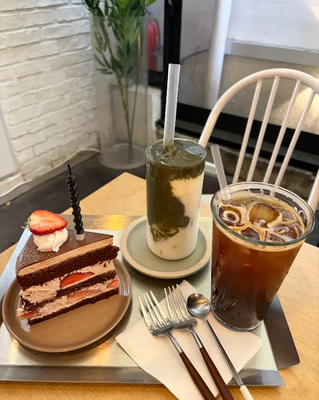 주문하고 자리에 앉아서 기다리는데, 테이블마다 놓인 작은 꽃병이 눈에 띄었어. 이런 디테일, 완전 감동이지. 드디어 쑥 라떼와 딸기말차쉬폰 케이크 등장! 비주얼부터 심쿵, 인스타 업로드 각!