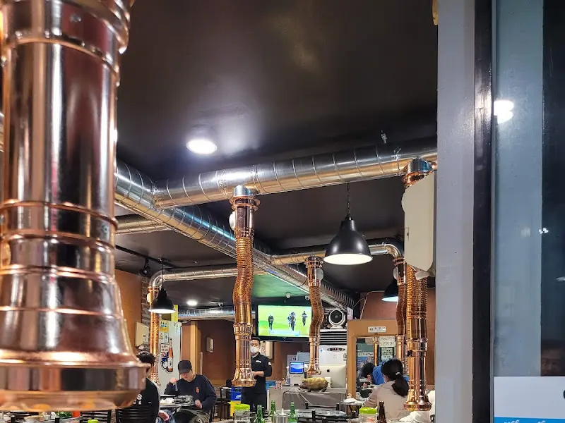 한 20분쯤 기다렸나? 드디어 내 이름이 불렸다. 쏴리질러! 문을 활짝 열고 들어서는 순간, 연탄불 향이 확 코를 찌르면서 식욕 풀파워 충전! 테이블마다 놓인 구리빛깔 연통 후드가 시선강탈, 완전 힙하다 힙해.