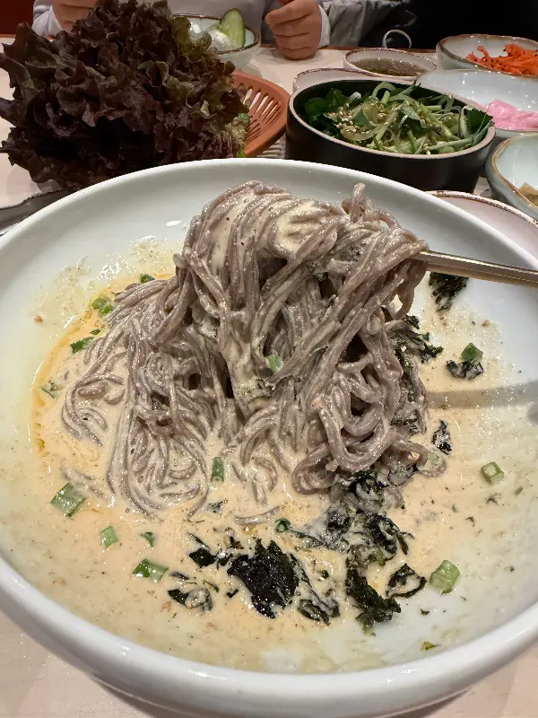 면발이 쫄깃쫄깃하고, 들기름의 고소함이 입안 가득 퍼지는데, 이 맛은 진짜 힙합이야!