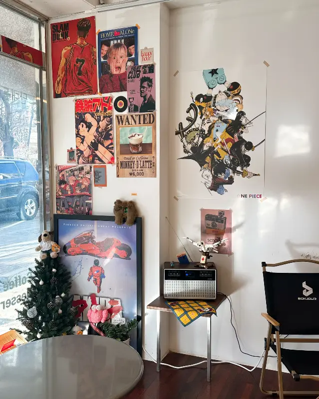 카페 문을 열자마자 느껴지는 따스함. 은은하게 퍼지는 커피 향이 코를 간지럽히고, 아늑한 조명이 나를 감싸 안는 듯했다. 마치 잘 꾸며진 친구네 집에 놀러 온 기분이랄까? 감각적인 인테리어 소품들이 눈길을 사로잡는데, 하나하나 사장님의 센스가 묻어나는 공간이었다. 처럼, 한쪽 벽면에는 힙한 포스터들이 가득 붙어있고, 아기자기한 소품들이 놓여 있어 구경하는 재미가 쏠쏠했다. 마치 내가 좋아하는 것들만 모아놓은 듯한 느낌적인 느낌!