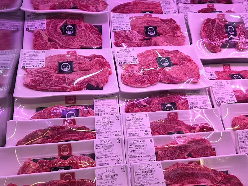 여기 시스템, 완전 내 스타일이야. 마치 정육 코너에 온 듯, 쇼케이스에서 내가 먹고 싶은 부위를 직접 골라! 마블링 예술인 한우들이 나 좀 데려가달라고 아우성치는 것 같잖아? 마치 랩 오디션 프로그램에 참가한 래퍼들처럼, 저마다의 매력을 뽐내는 한우들 앞에서 잠시 고민에 빠졌지. 오늘 나의 선택은… 바로 너!