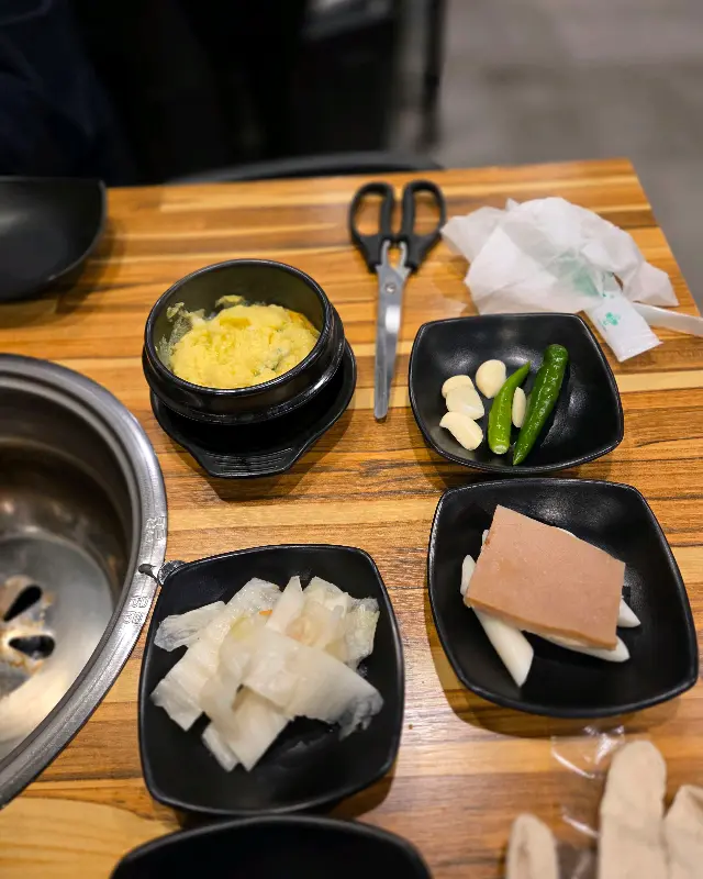 주문 끝나자마자 테이블 세팅, 스피드 실화냐? 젓가락, 집게, 물티슈 완비. 깔끔함에 감탄하는 사이, 밑반찬 등장! 윤기 좔좔 흐르는 김치, 매콤달콤 양념에 버무려진 양파절임, 쌈무까지. 특히 눈에 띄는 건 뽀얀 돼지껍데기 한 점. 기대감 MAX!