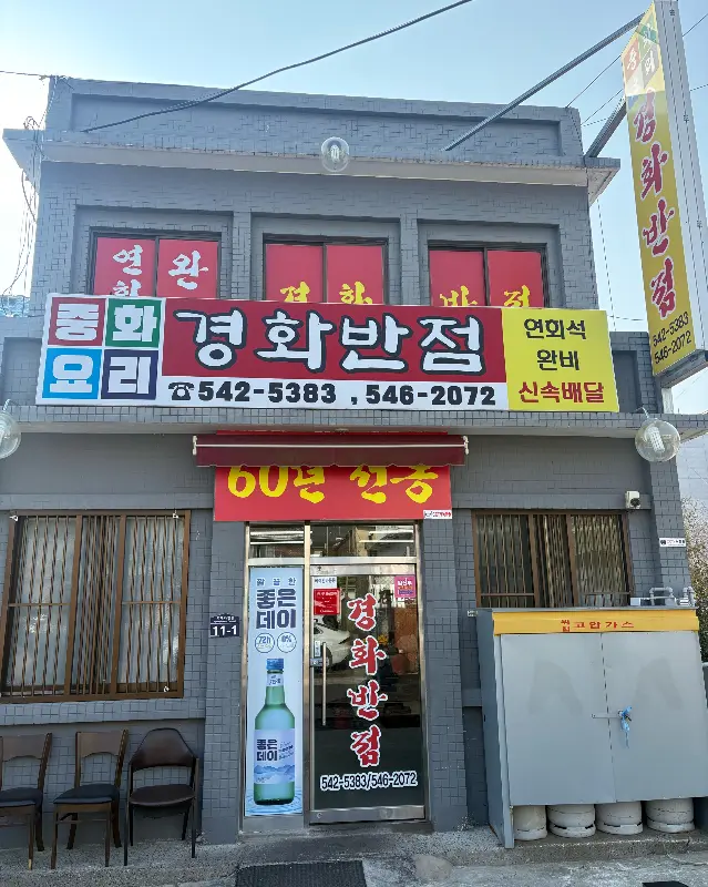 오랜만에 연구실을 벗어나 미각 탐험에 나섰다. 오늘의 목적지는 60년 전통을 자랑하는 경화반점. 간판에서부터 풍기는 노포의 아우라가 나의 실험 정신을 자극한다. 단순한 식사가 아닌, 시간을 거슬러 올라가는 미식 여행을 기대하며 설레는 마음으로 차에 시동을 걸었다. 이미지에서 보듯, 세월의 흔적이 느껴지는 외관은 그 자체로도 훌륭한 볼거리였다.